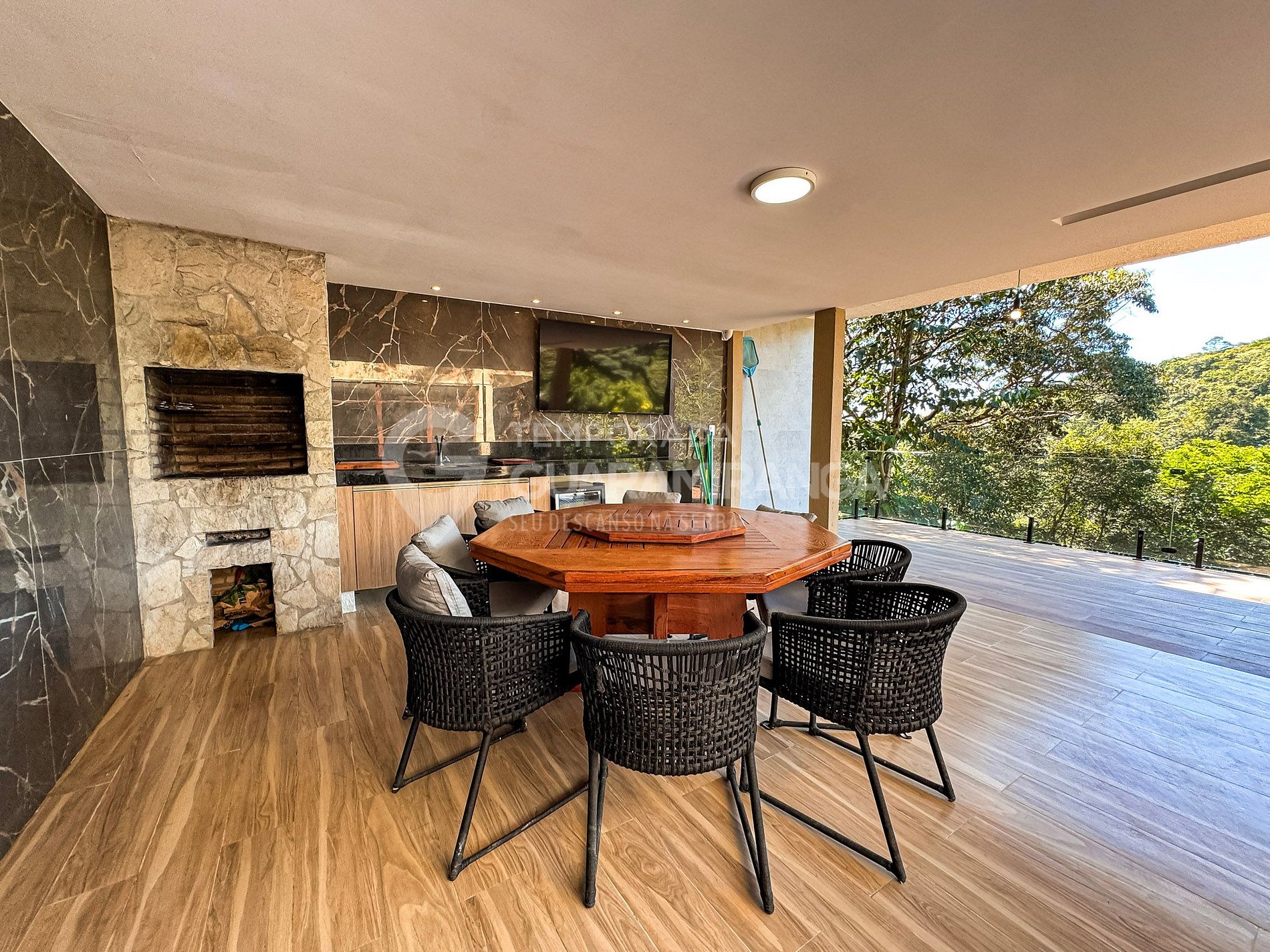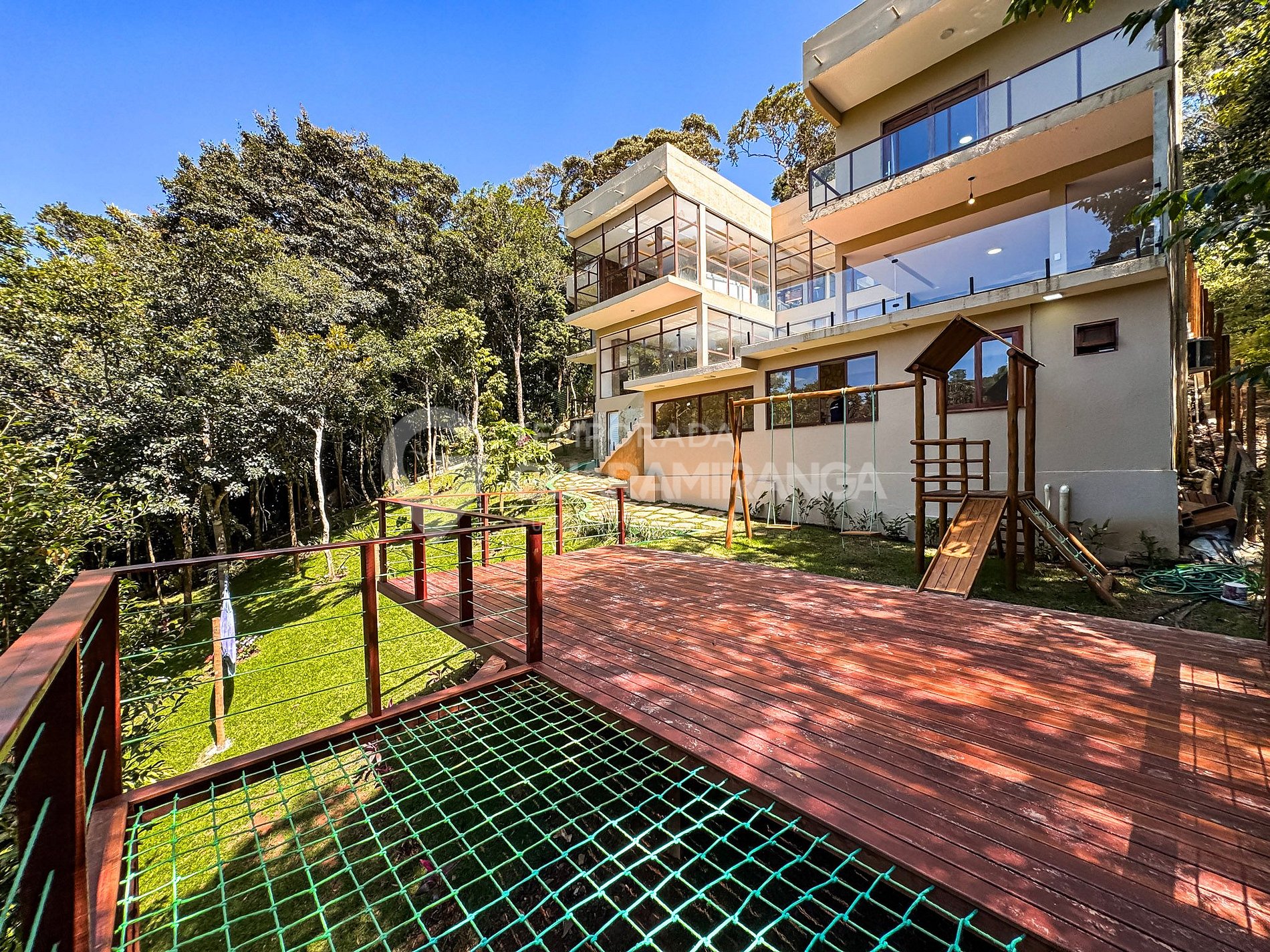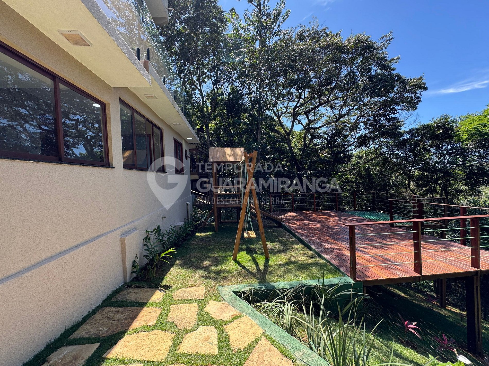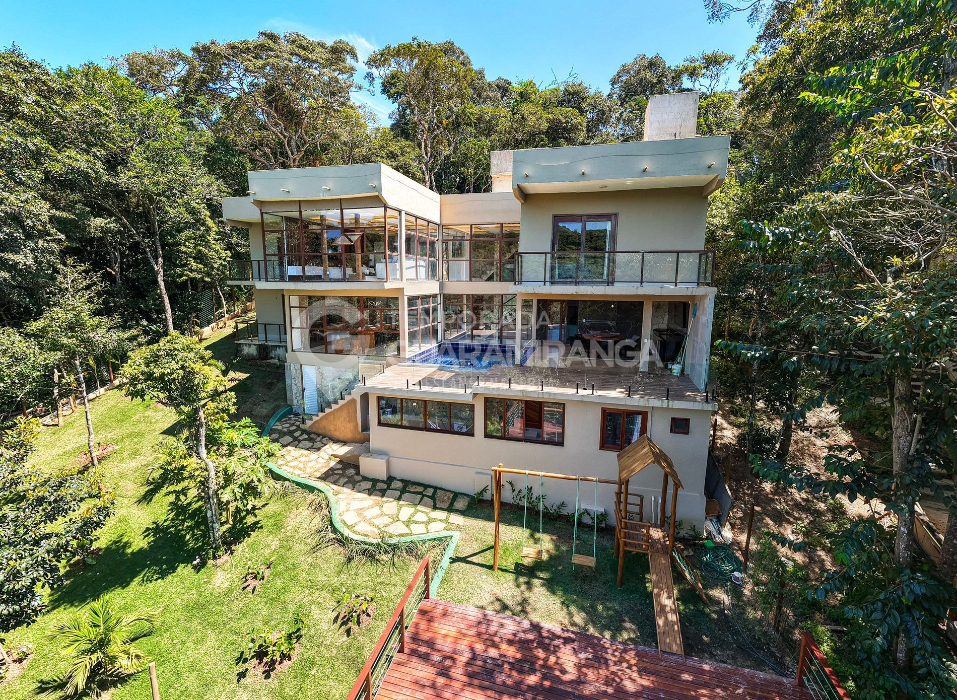 Mansion with 5 air-conditioned suites, heated pool, gourmet area, TV in all rooms, hammock area, playground, and a deck with breathtaking views.