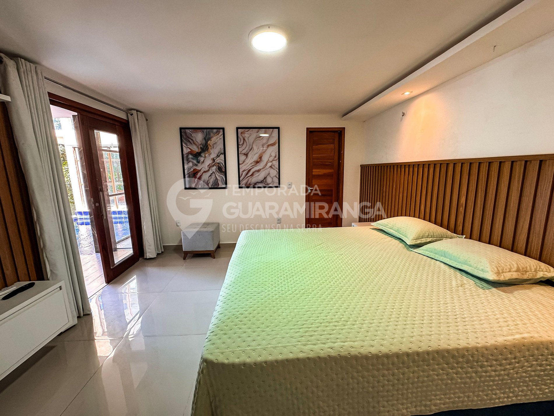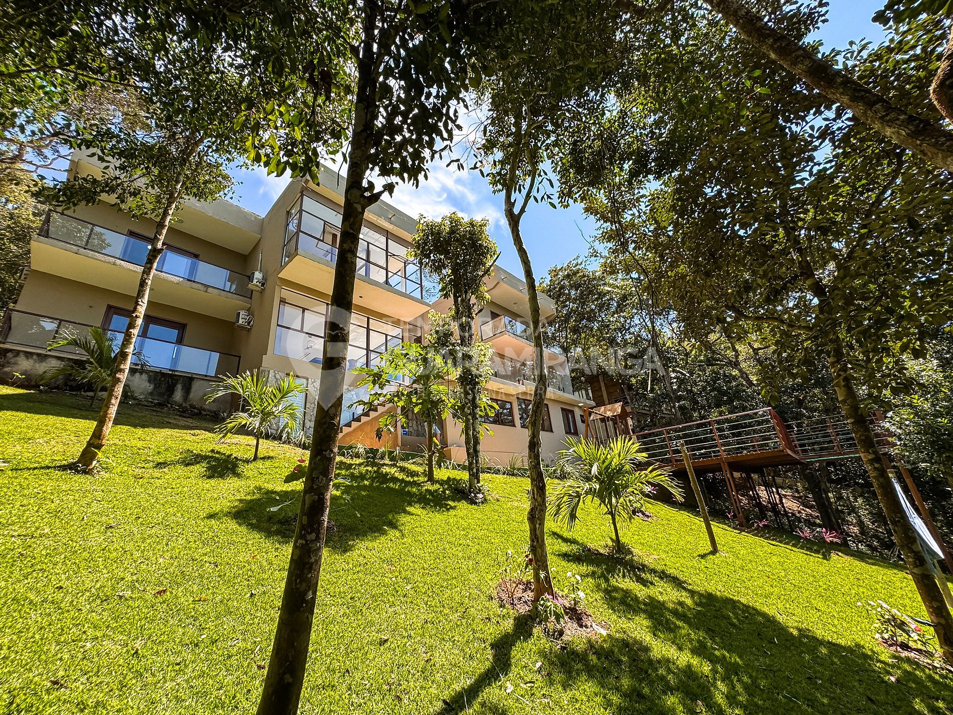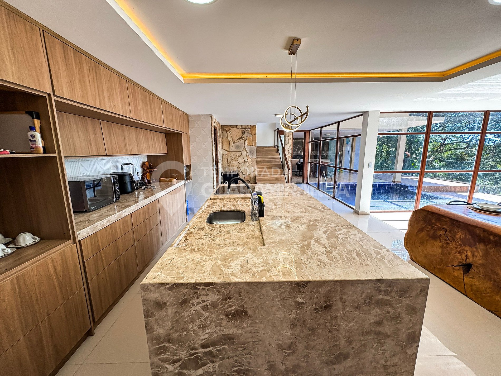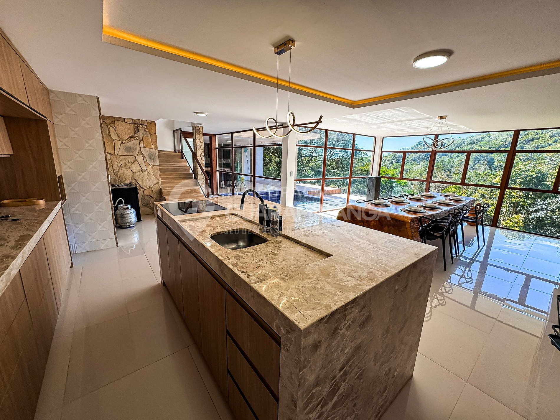 Mansion with 5 air-conditioned suites, heated pool, gourmet area, TV in all rooms, hammock area, playground, and a deck with breathtaking views.