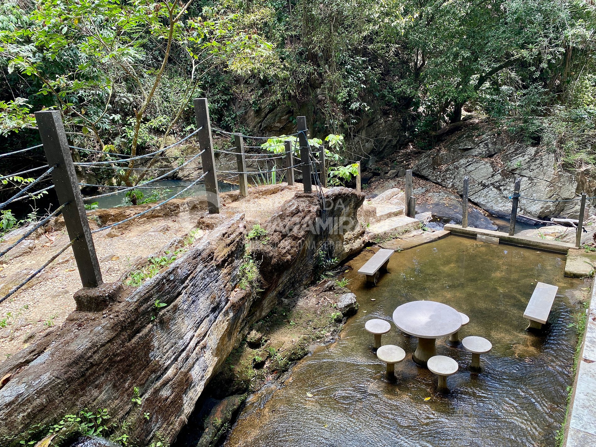 • Cachoeira privativa com espaço de apoio, mesas, bancos e churrasqueira.