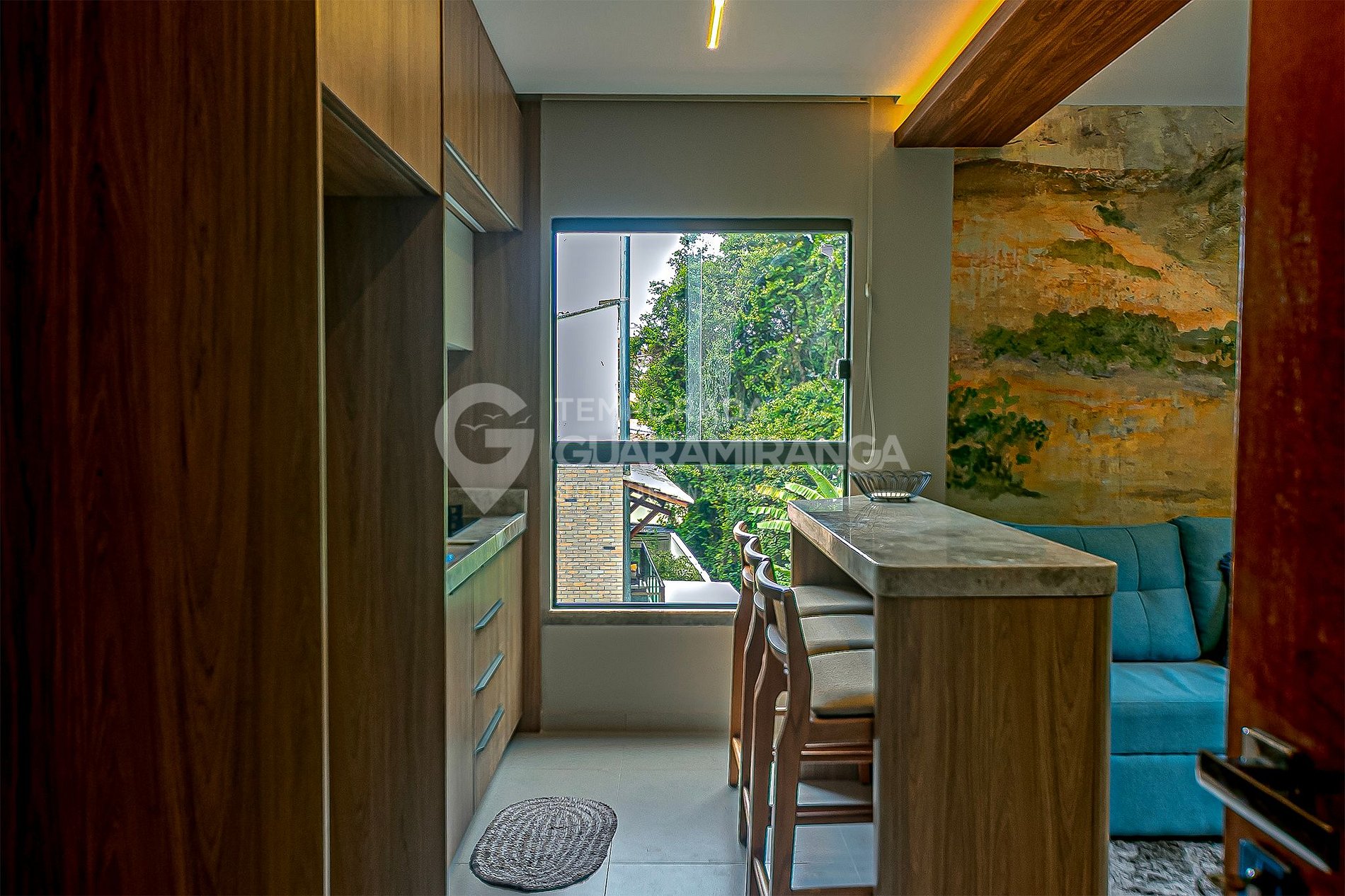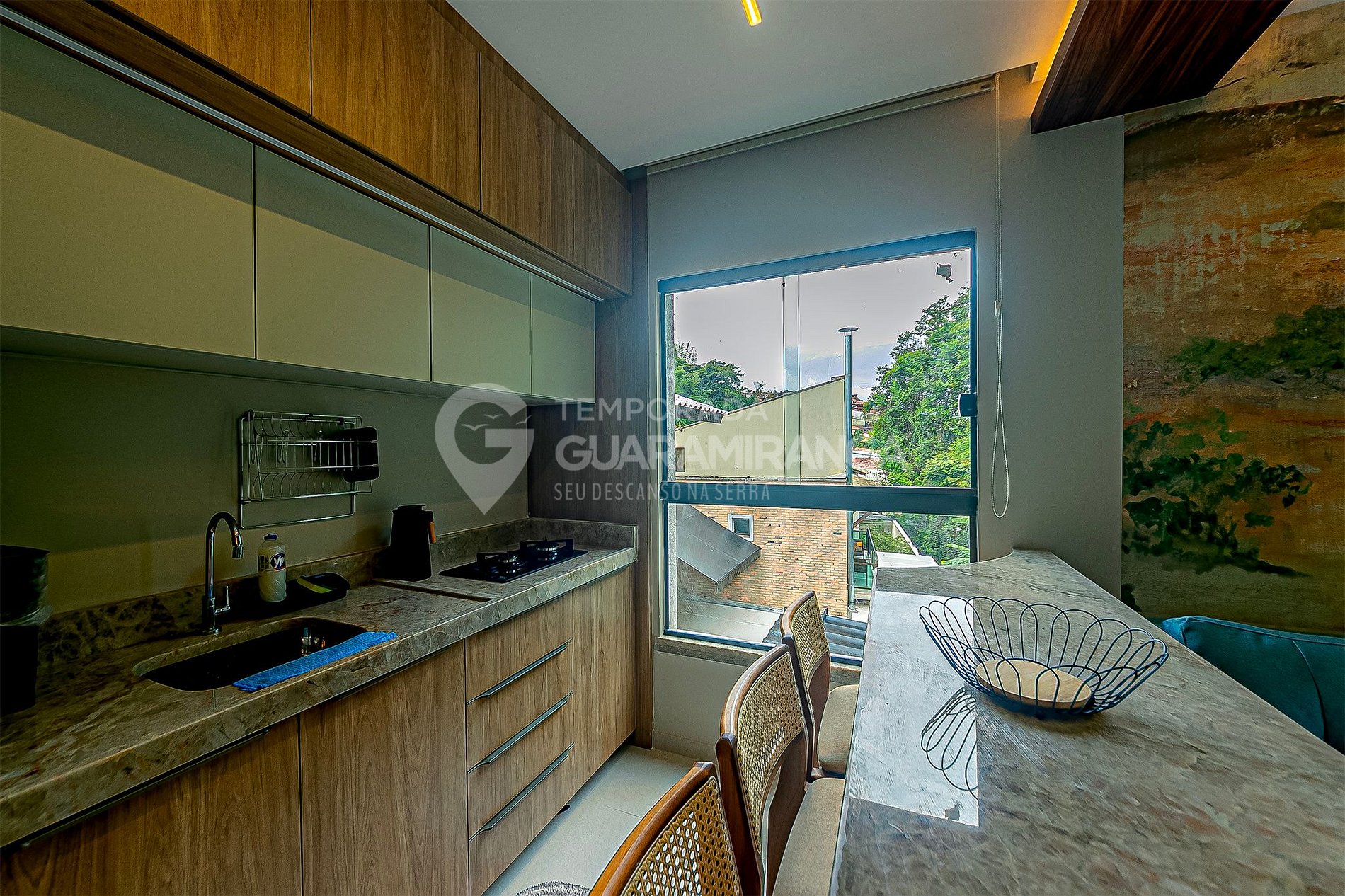 • Ambiente aconchegante, com sala de estar e cozinha americana.